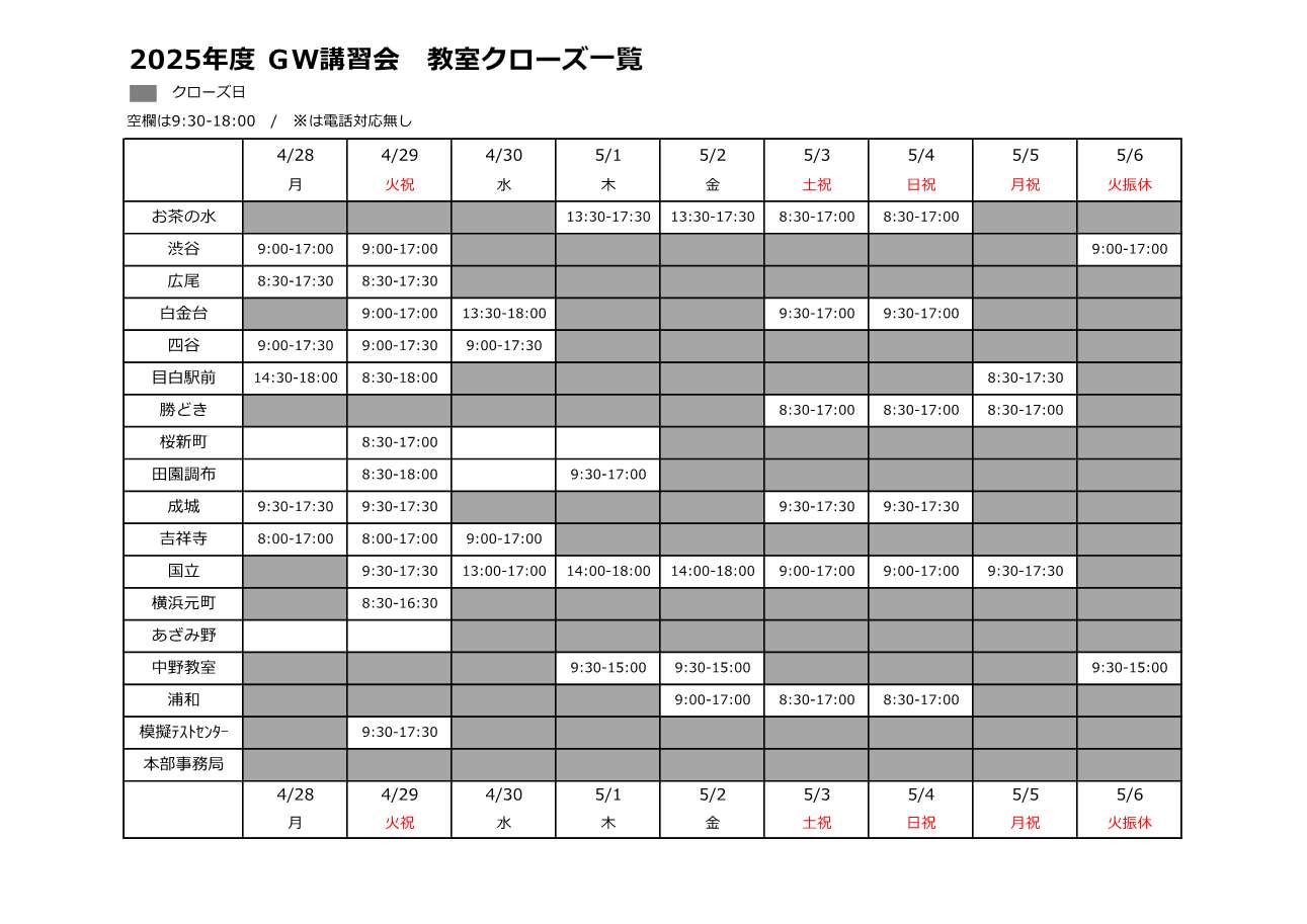 2025年 GW講習会期間中の教室営業時間のお知らせです。